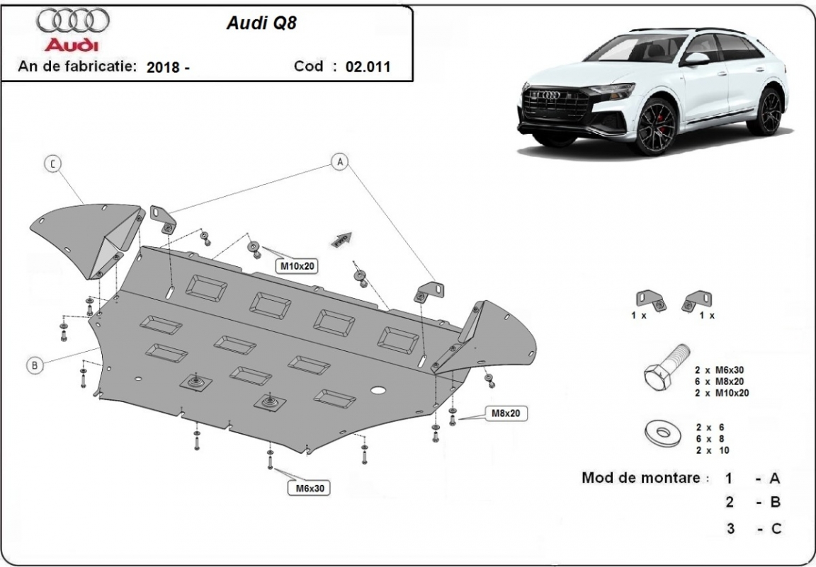 Voor de bescherming van: motor, radiator, voorbumper De motor beschermplaat is nieuw en past perfect bij alle versies van Audi Q8 geproduceerd tussen 2018 en 2020. Gemaakt van 2 mm dikke Staalplaat. Schroeven, moeren, alle bevestigingsaccessoires zijn inbegrepen. Alle carterbeschermplaten zijn poedergecoat, om corrosie te vermijden. De buitenkant van de carterbeschermplaten heeft staalversterkingen, waardoor de weerstand tegen impact wordt verhoogd. |