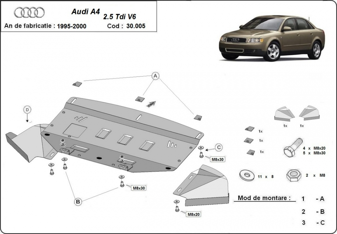 Voor de bescherming van: motor, radiator, voorbumper De motor beschermplaat is nieuw en past perfect bij de Audi A4 B5, met de volgende motor / aandrijfversies: petrol V6, 2.6, 2.8, diesel - 2.5 D - geproduceerd tussen 1997 en 2000. Het heeft een opening voor de oliecarter, dus hoeft het niet verwijderd worden bij olieverversing. Gemaakt van 2 mm dikke Staalplaat. Schroeven, moeren, alle bevestigingsaccessoires zijn inbegrepen. Alle carterbeschermplaten zijn poedergecoat, om corrosie te vermijden. De buitenkant van de carterbeschermplaten heeft staalversterkingen, waardoor de weerstand tegen impact wordt verhoogd. |