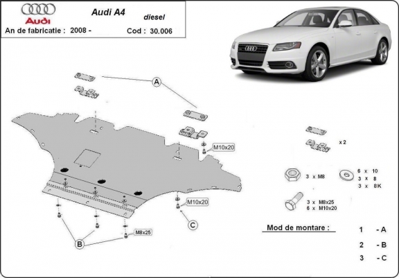 Voor de bescherming van: motor, radiator, voorbumper De motor beschermplaat is nieuw en past perfect bij de Audi A4 B8, met de volgende motor / aandrijfversies: 2.0TFSI,2.0Tdi, quatro, 2.7TDI - geproduceerd tussen 2008 en 2015. Het heeft een opening voor de oliecarter, dus hoeft het niet verwijderd worden bij olieverversing. Gemaakt van 2 mm dikke Staalplaat. Schroeven, moeren, alle bevestigingsaccessoires zijn inbegrepen. Alle carterbeschermplaten zijn poedergecoat, om corrosie te vermijden. De buitenkant van de carterbeschermplaten heeft staalversterkingen, waardoor de weerstand tegen impact wordt verhoogd. |