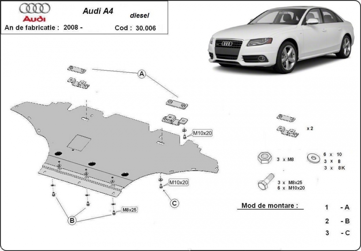 Der beiden gr. Schutzbleche passen zu 100%... was bei meinem Audi a4 B8 (8k5) nicht passt sind die beiden vorderen Halter. Die vorderen Halter sorgen dafür da man das Blech nicht unter die Stoßstange schieben kann. Habe mir da etwas anderen einfallen lassen und nun passt es