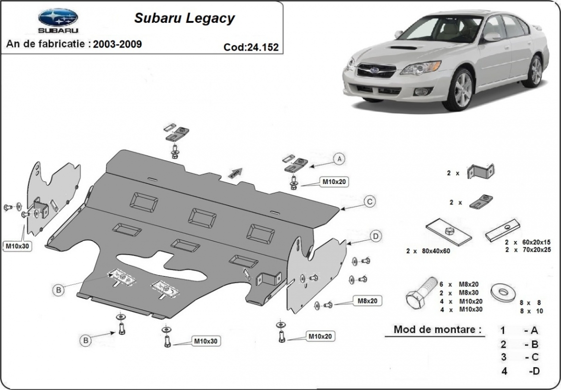 Voor de bescherming van: motor, radiator De motor beschermplaat is nieuw en past perfect bij alle versies van Subaru Legacy IV geproduceerd tussen 2003 en 2009. Gemaakt van 2 mm dikke Staalplaat. Schroeven, moeren, alle bevestigingsaccessoires zijn inbegrepen. Alle carterbeschermplaten zijn poedergecoat, om corrosie te vermijden. De buitenkant van de carterbeschermplaten heeft staalversterkingen, waardoor de weerstand tegen impact wordt verhoogd. |