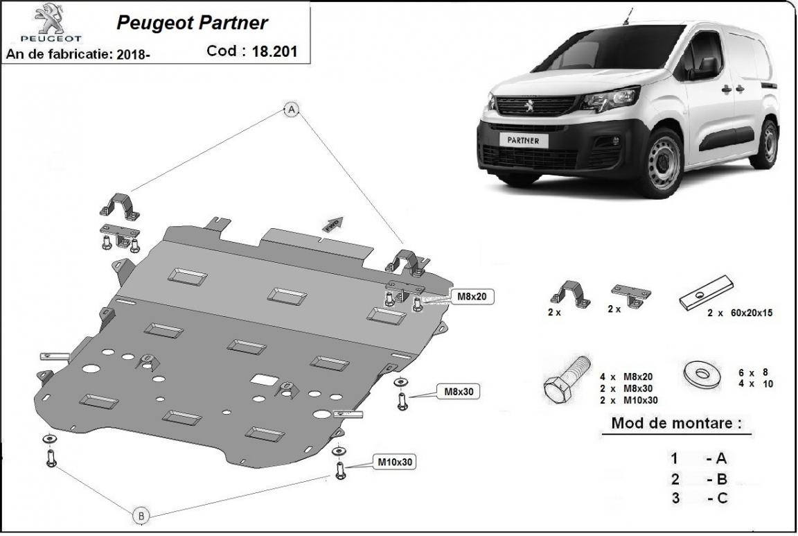 Voor de bescherming van: motor, versnellingsbak, radiator, voorbumper De motor beschermplaat is nieuw en past perfect bij alle versies van Peugeot Partner geproduceerd tussen 2018 en 2026. Gemaakt van 2 mm dikke Staalplaat. Schroeven, moeren, alle bevestigingsaccessoires zijn inbegrepen. Alle carterbeschermplaten zijn poedergecoat, om corrosie te vermijden. De buitenkant van de carterbeschermplaten heeft staalversterkingen, waardoor de weerstand tegen impact wordt verhoogd. |