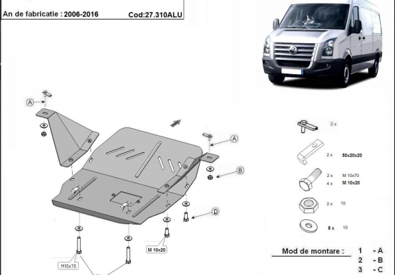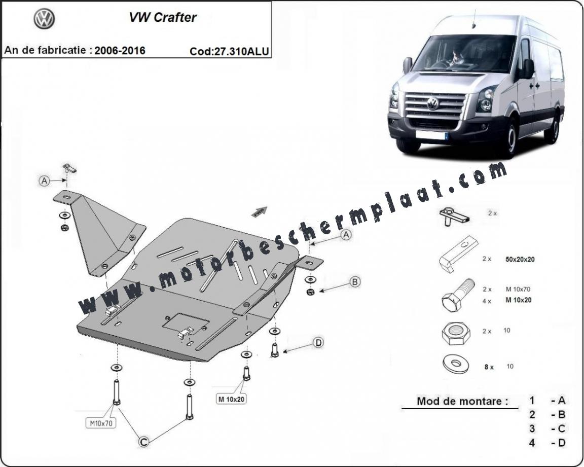 Voor de bescherming van: motor, versnellingsbak De motor beschermplaat is nieuw en past perfect bij alle versies van Volkswagen Crafter geproduceerd tussen 2006 en 2016. Gemaakt van 3 mm dikke Aluminiumplaat. De schilden zijn van aluminium, maar de bevestigingssteunen zijn van staal. Schroeven, moeren, alle bevestigingsaccessoires zijn inbegrepen. Alle carterbeschermplaten zijn poedergecoat, om corrosie te vermijden. De buitenkant van de carterbeschermplaten heeft staalversterkingen, waardoor de weerstand tegen impact wordt verhoogd. |