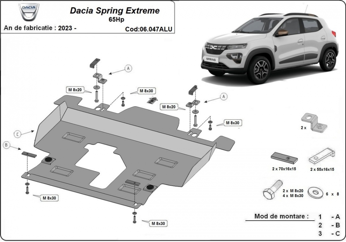 Voor de bescherming van: motor, versnellingsbak, radiator De motor beschermplaat is nieuw en past perfect bij alle versies van Dacia Spring geproduceerd tussen 2023 en 2026. Gemaakt van 4 mm dikke Aluminiumplaat. De schilden zijn van aluminium, maar de bevestigingssteunen zijn van staal. Schroeven, moeren, alle bevestigingsaccessoires zijn inbegrepen. Alle carterbeschermplaten zijn poedergecoat, om corrosie te vermijden. De buitenkant van de carterbeschermplaten heeft staalversterkingen, waardoor de weerstand tegen impact wordt verhoogd. |