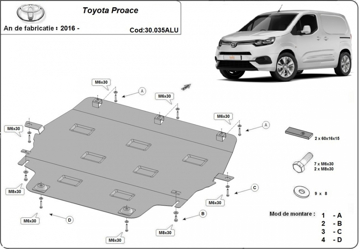 Voor de bescherming van: motor, versnellingsbak, radiator De motor beschermplaat is nieuw en past perfect bij alle versies van Toyota Proace geproduceerd tussen 2016 en 2026. Gemaakt van 3 mm dikke Aluminiumplaat. De schilden zijn van aluminium, maar de bevestigingssteunen zijn van staal. Schroeven, moeren, alle bevestigingsaccessoires zijn inbegrepen. Alle carterbeschermplaten zijn poedergecoat, om corrosie te vermijden. De buitenkant van de carterbeschermplaten heeft staalversterkingen, waardoor de weerstand tegen impact wordt verhoogd. |
