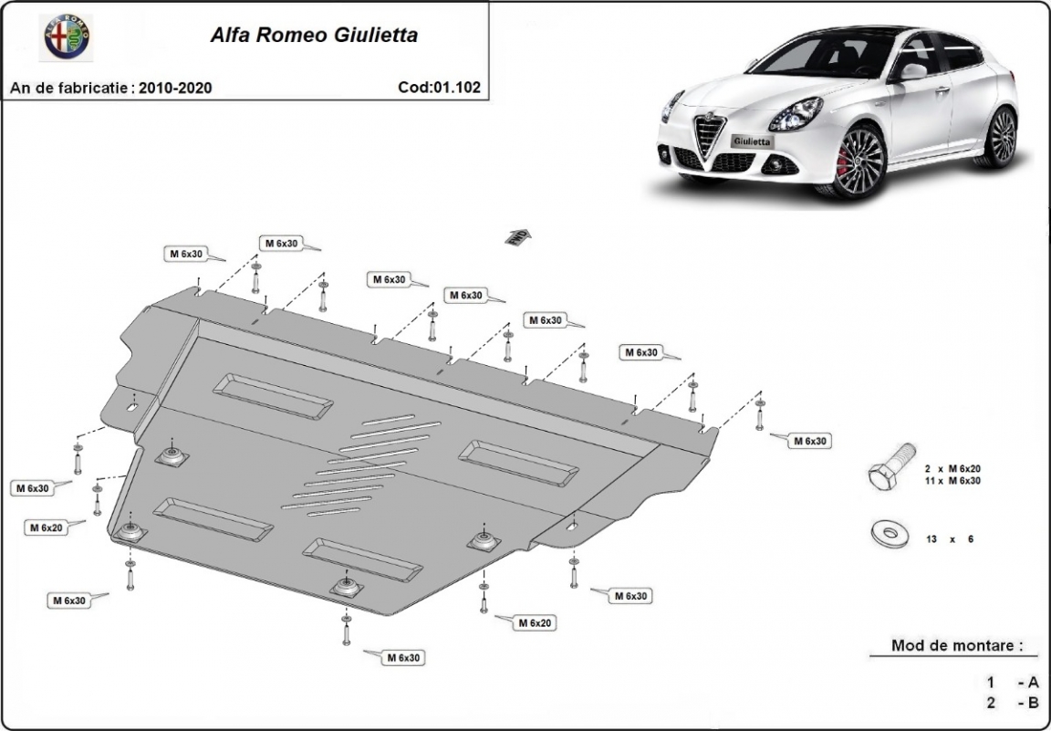 Voor de bescherming van: motor, versnellingsbak, radiator De motor beschermplaat is nieuw en past perfect bij alle versies van Alfa Romeo Giulietta geproduceerd tussen 2010 en 2020. Gemaakt van 2 mm dikke Staalplaat. Schroeven, moeren, alle bevestigingsaccessoires zijn inbegrepen. Alle carterbeschermplaten zijn poedergecoat, om corrosie te vermijden. De buitenkant van de carterbeschermplaten heeft staalversterkingen, waardoor de weerstand tegen impact wordt verhoogd. |