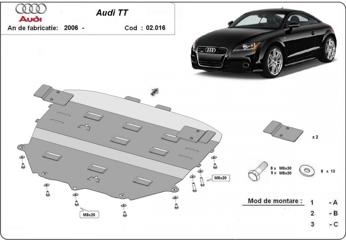 Voor de bescherming van: motor, versnellingsbak, radiator, voorbumper De motor beschermplaat is nieuw en past perfect bij alle versies van Audi TT geproduceerd tussen 2006 en 2014. Gemaakt van 2 mm dikke Staalplaat. Schroeven, moeren, alle bevestigingsaccessoires zijn inbegrepen. Alle carterbeschermplaten zijn poedergecoat, om corrosie te vermijden. De buitenkant van de carterbeschermplaten heeft staalversterkingen, waardoor de weerstand tegen impact wordt verhoogd. |