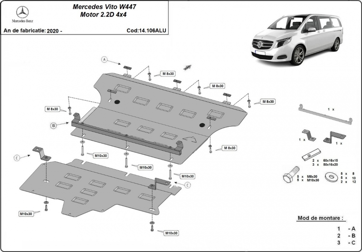 Voor de bescherming van: motor, versnellingsbak, radiator De motor beschermplaat is nieuw en past perfect bij de Mercedes Vito W447, met de volgende motor / aandrijfversies: 2.0, 2.2 D, 4x4 - geproduceerd tussen 2020 en 2026. Gemaakt van 3 mm dikke Aluminiumplaat. De schilden zijn van aluminium, maar de bevestigingssteunen zijn van staal. Schroeven, moeren, alle bevestigingsaccessoires zijn inbegrepen. Alle carterbeschermplaten zijn poedergecoat, om corrosie te vermijden. De buitenkant van de carterbeschermplaten heeft staalversterkingen, waardoor de weerstand tegen impact wordt verhoogd. |