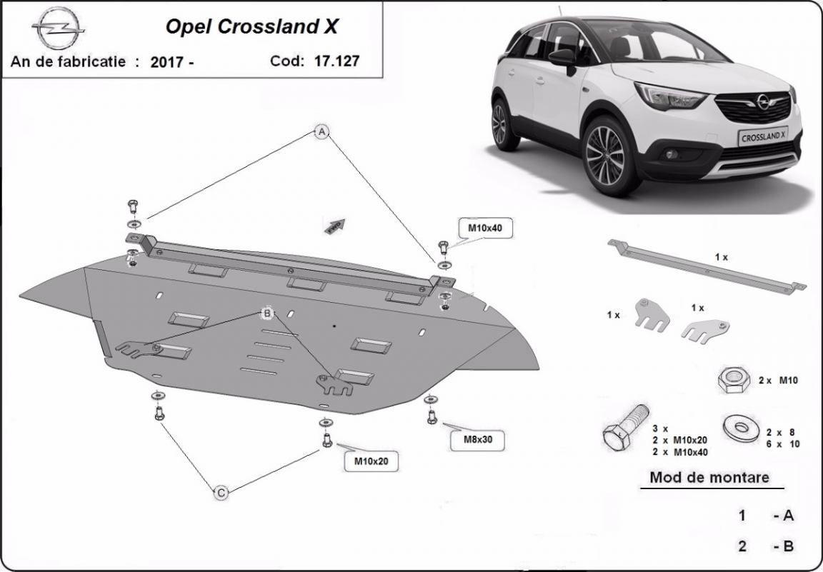 Voor de bescherming van: motor, versnellingsbak, radiator, voorbumper De motor beschermplaat is nieuw en past perfect bij alle versies van Opel Crossland X geproduceerd tussen 2017 en 2026. Gemaakt van 2 mm dikke Staalplaat. Schroeven, moeren, alle bevestigingsaccessoires zijn inbegrepen. Alle carterbeschermplaten zijn poedergecoat, om corrosie te vermijden. De buitenkant van de carterbeschermplaten heeft staalversterkingen, waardoor de weerstand tegen impact wordt verhoogd. |