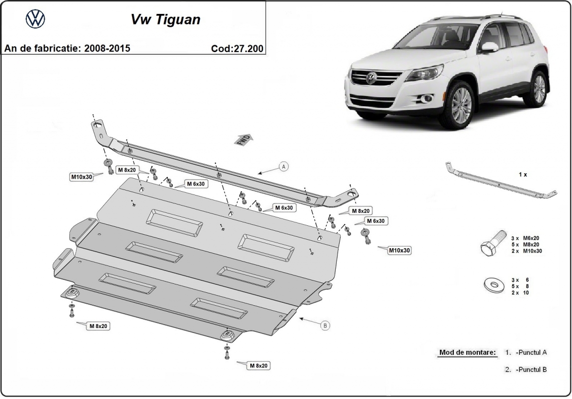 Voor de bescherming van: motor, versnellingsbak, radiator, voorbumper De motor beschermplaat is nieuw en past perfect bij alle versies van VW Tiguan geproduceerd tussen 2008 en 2015. Gemaakt van 2 mm dikke Staalplaat. Schroeven, moeren, alle bevestigingsaccessoires zijn inbegrepen. Alle carterbeschermplaten zijn poedergecoat, om corrosie te vermijden. De buitenkant van de carterbeschermplaten heeft staalversterkingen, waardoor de weerstand tegen impact wordt verhoogd. |