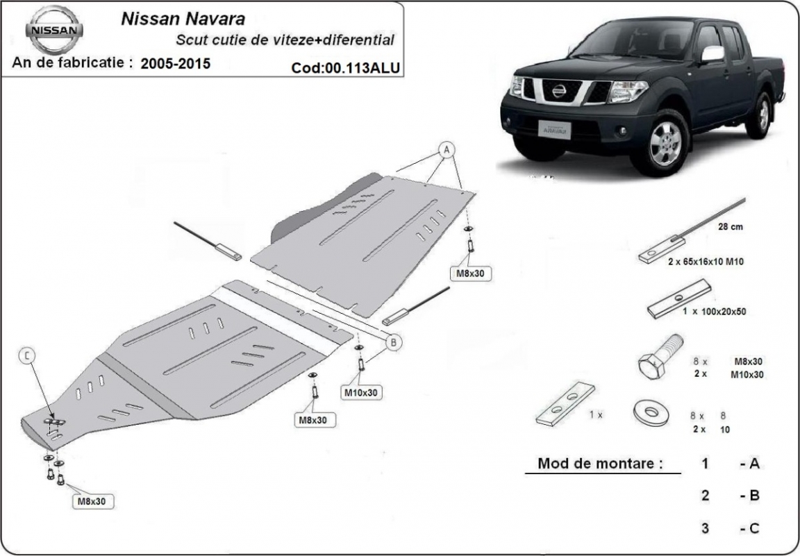 Voor de bescherming van: versnellingsbak, overdracht geval De motor beschermplaat is nieuw en past perfect bij alle versies van Nissan Navara geproduceerd tussen 2005 en 2015. Gemaakt van 4 mm dikke Aluminiumplaat. De schilden zijn van aluminium, maar de bevestigingssteunen zijn van staal. Schroeven, moeren, alle bevestigingsaccessoires zijn inbegrepen. Alle carterbeschermplaten zijn poedergecoat, om corrosie te vermijden. De buitenkant van de carterbeschermplaten heeft staalversterkingen, waardoor de weerstand tegen impact wordt verhoogd. |