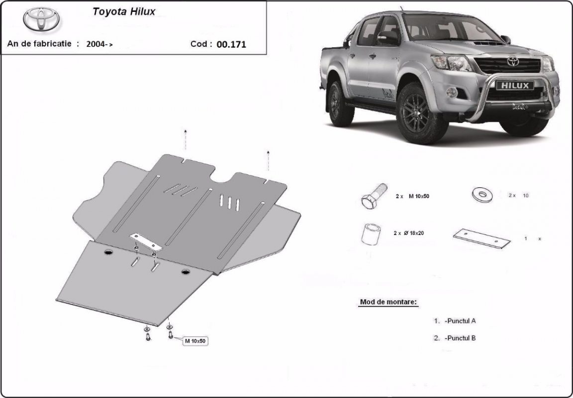 Voor de bescherming van: versnellingsbak, differentieel, DPF , deeltjes filter De motor beschermplaat is nieuw en past perfect bij alle versies van Toyota Hilux geproduceerd tussen 2004 en 2015. Gemaakt van 3 mm dikke Staalplaat. Schroeven, moeren, alle bevestigingsaccessoires zijn inbegrepen. Alle carterbeschermplaten zijn poedergecoat, om corrosie te vermijden. De buitenkant van de carterbeschermplaten heeft staalversterkingen, waardoor de weerstand tegen impact wordt verhoogd. |